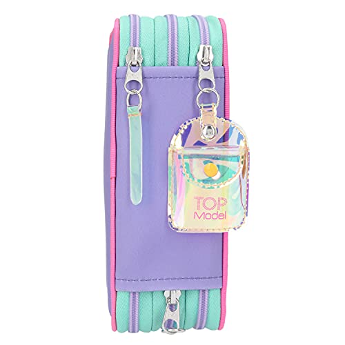 In dit 3-voudige etui in topmodel Miami design is genoeg ruimte voor alle pennen, tekengerei en wat je kind anders nog op school nodig heeft. In de gevulde map bevinden zich 18 viltstiften in actuele kleuren in het onderste vak en 18 kleurpotloden in dezelfde kleuren in het middelste vak. In het bovenste vak zijn een lijmstift, een gum, een dubbele puntenslijper, een schaar, twee potloden in verschillende diktes en een liniaal (15 cm) te vinden. Bovendien heeft de map een klein geheim vak. De hoes van het ongeveer 20 x 13 x 7,5 cm grote etui is versierd met een zomers topmodelmotief op een glinsterende achtergrond. De kleuren turquoise, roze en paars maken zin in de zomer.